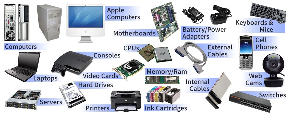 PCs / Laptops, Apple – iMacs, MacBooks and Macintoshes etc.Tablets, iPadsServers, Server InfrastructureSwitches, Routers/ModemsKeyboards, MiceLCD ScreensUPSsPrinters, Ink/Photocopier CartridgesCell PhonesComputer CablesMotherboards, CPUs, HDDs, PSUs, Video Cards, Memory/RAMPlaystation, Xbox, Nintendo